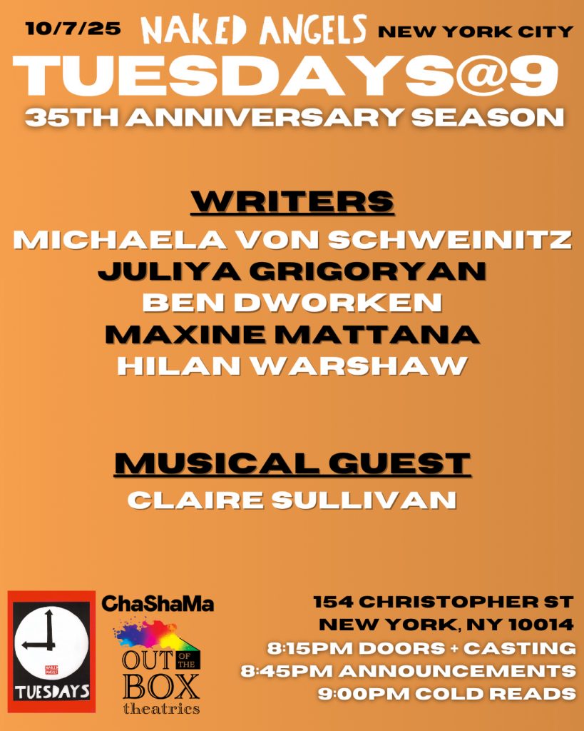 Naked Angels NYC selected chapters from Driving Lessons as solo pieces for their cold reading series Tuesdays@9.